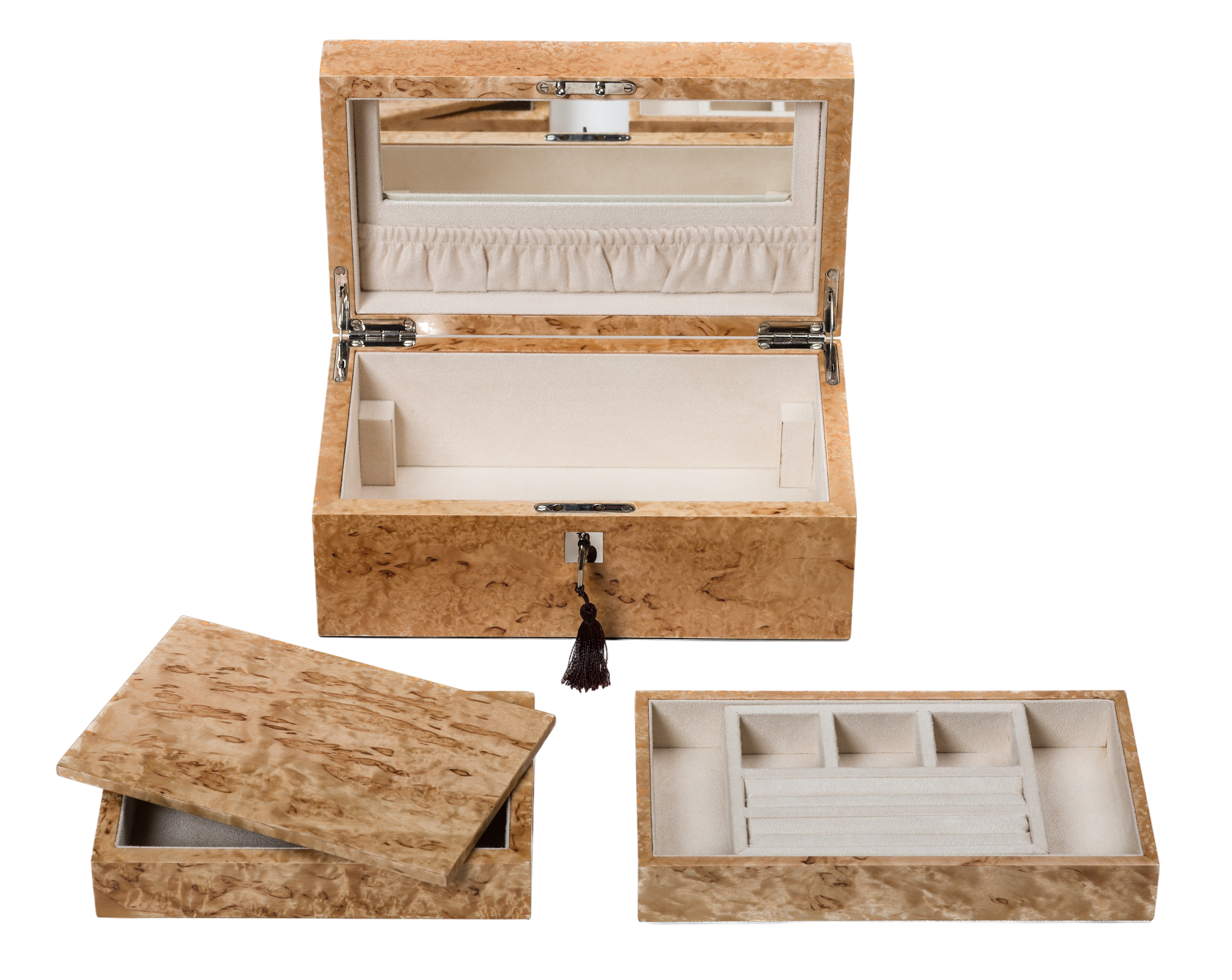 This jewellery box has a contemporary feel and is handmade in one of the rarest and most luxurious woods in the world. Karelian Birch is a truly royal wood, originally only used for the Tzars' furniture.