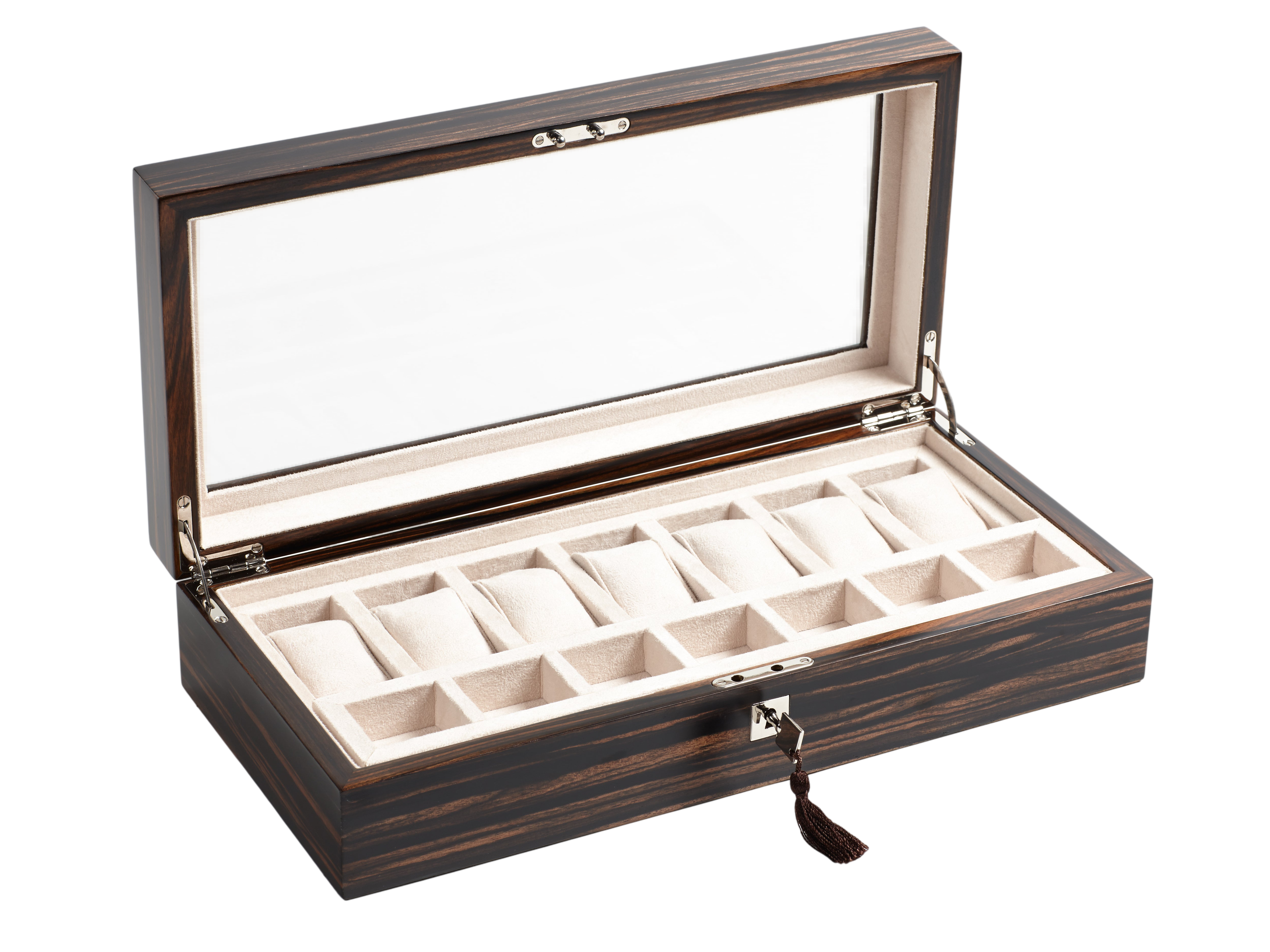 There is a two-level tray to place and match your rings, cufflinks and other dressing accessories with your watches. The box is lined in faux suede and includes two tasseled keys. Superior quality nickel plated hinges and hardware are used.